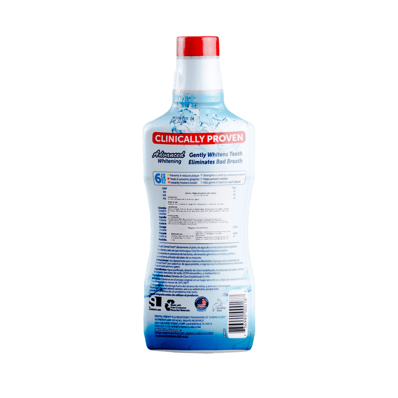 Agregue 1 cucharadita de Dental Fresh a 17 onzas de agua potable. El uso diario da como resultado un aliento con olor más fresco y dientes y encías más saludables. Seguro y eficaz para perros y gatos. Aplicar Dental fresh en el agua de bebida no implica que el agua se debe de cambiar. Con frecuencia cambiar el agua del bebero.